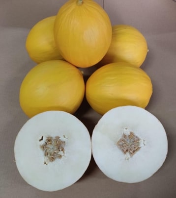 Melon jaune sucré et parfumé, à la chair tendre et juteuse. Sa peau jaune dorée cache une chair savoureuse qui ravira les amateurs de melons. Disponible en 2 formats différents pour s'adapter à tous les besoins : format caisse (400 kg, pièces de 2-3,5 kg) et format boîte (4 pièces de 1,5-2 kg chacune).