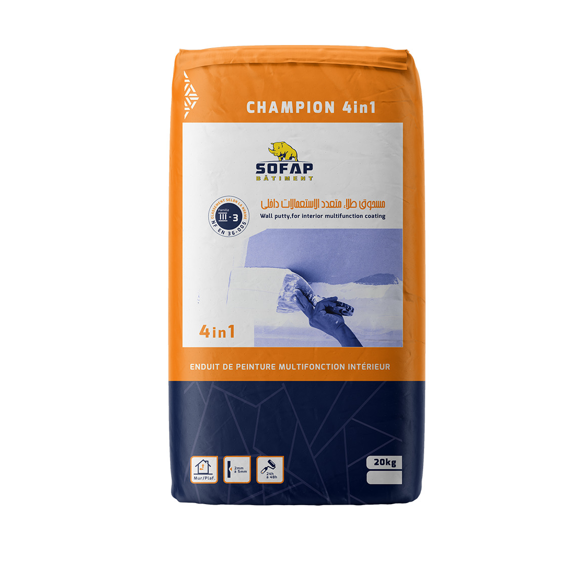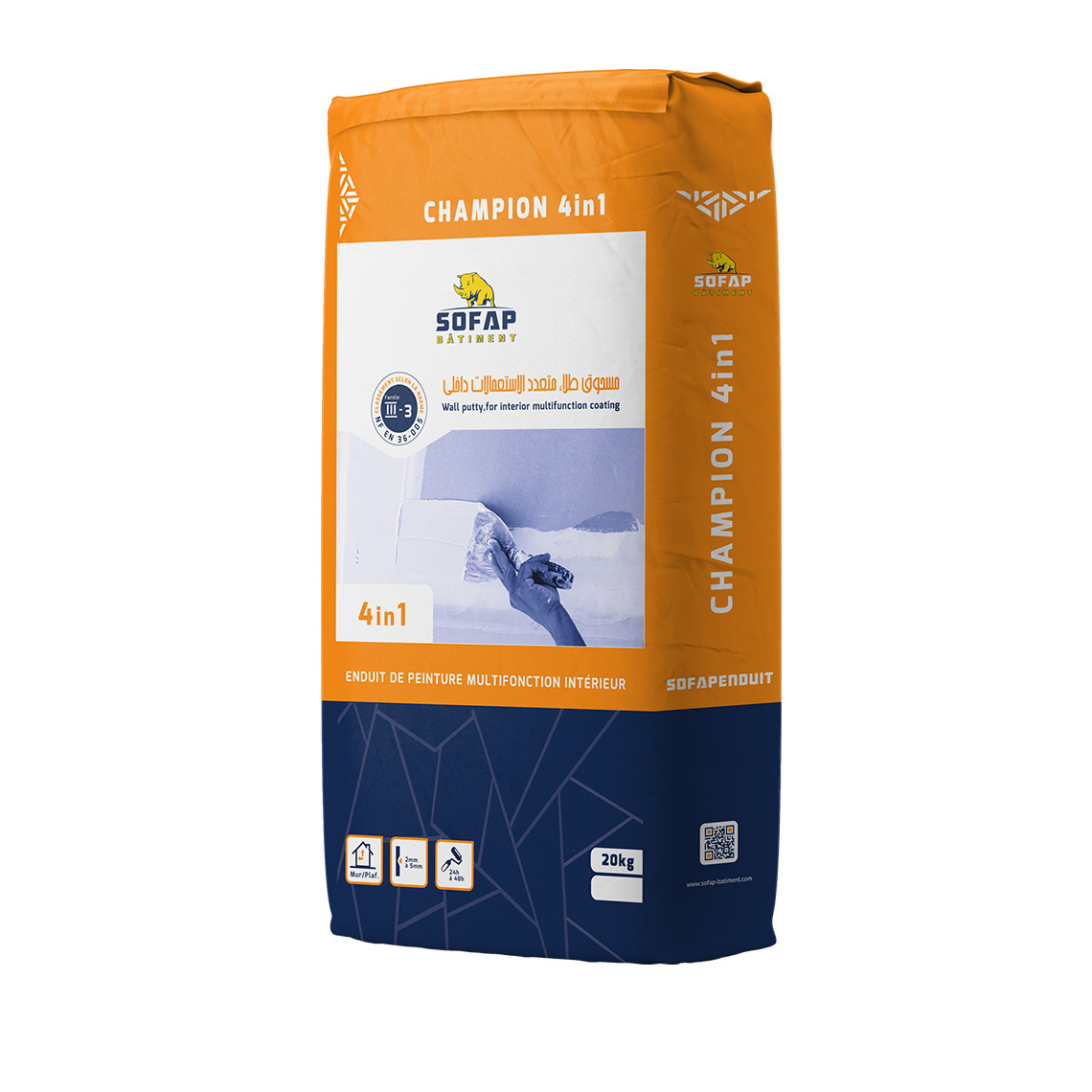 CHAMPION 4 IN 1 est un enduit en poudre de haute qualité multifonction : Rebouchage, ragréage et finition fine en application manuelle sur les murs et les plafonds en intérieur.