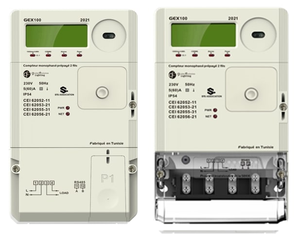 Le compteur GEX100 est un modèle monophasé prépayé, de type "split" avec clavier, conçu pour un montage sur rail DIN. Il est conforme au protocole STS pour le cryptage des données. Les informations du compteur peuvent être consultées directement sur l'écran LCD de l'interface client.