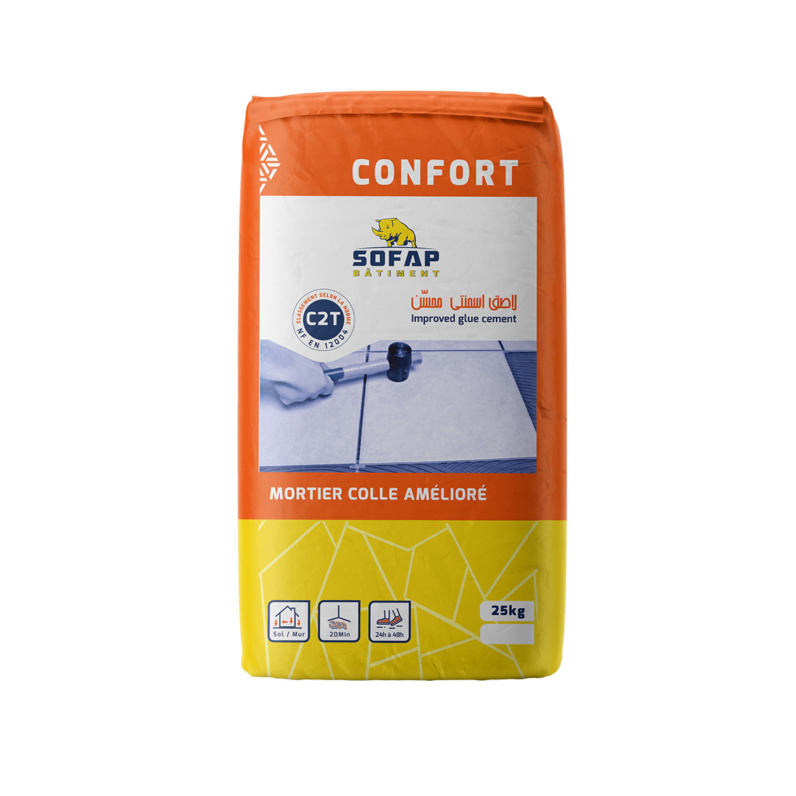 Mortier colle amélioré, résistant au glissement, à base de ciment, destiné à la pose des carreaux céramiques sur supports neufs et anciens en sols et murs intérieurs et sols extérieurs.
