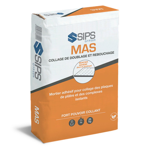 MAS est un mortier de collage pour les ouvrages en plaques de plâtre et les complexes isolants, produit à partir du gisement de gypse naturel pur ayant subi une cuisson, des traitements appropriés et des charges minérales naturelles pures.